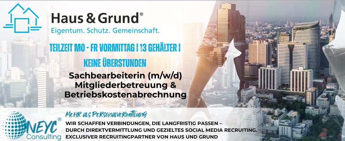 NEYC Consulting ist exclusiver Recruitingpartner der Haus und Grund und erster Ansprechpartner für Bewerberinnen und Bewerber. Wir stehen für alle Fragen zur Verfügung und stellen sicher, dass der Bewerbungsprozess offen, authentisch und werteorientiert abläuft.